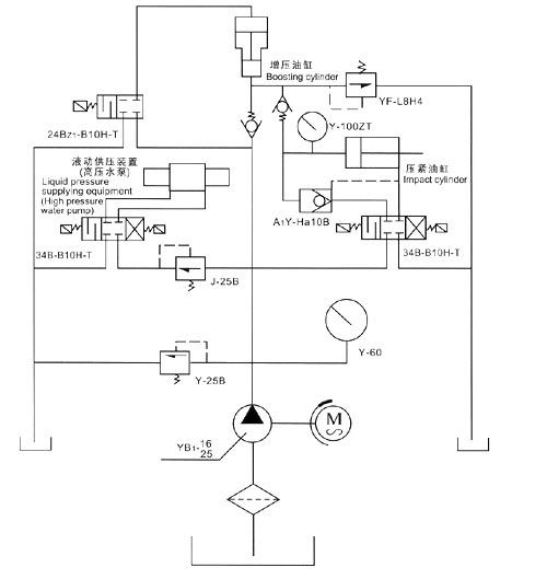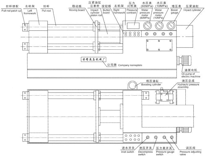 四、接通电源,按油泵起动,检查电机转动方向是否正确(顺时针方向),调节油泵压力在5 0MPa进行试机,检查各管路有无泄漏,发现不良现象应立即进行检修。