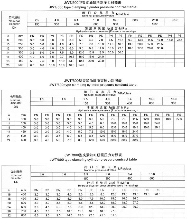 7、     JWT-800型 阀门公称通径与公称压力试验范围