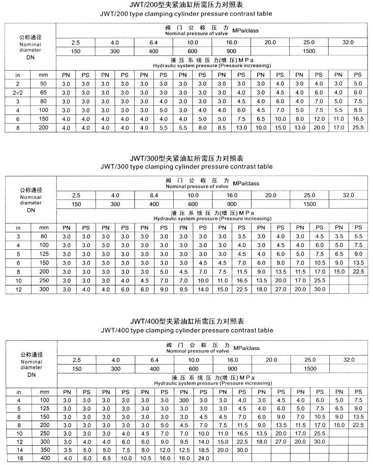 3  、   JWT-300型 阀门公称通径与公称压力试验范围