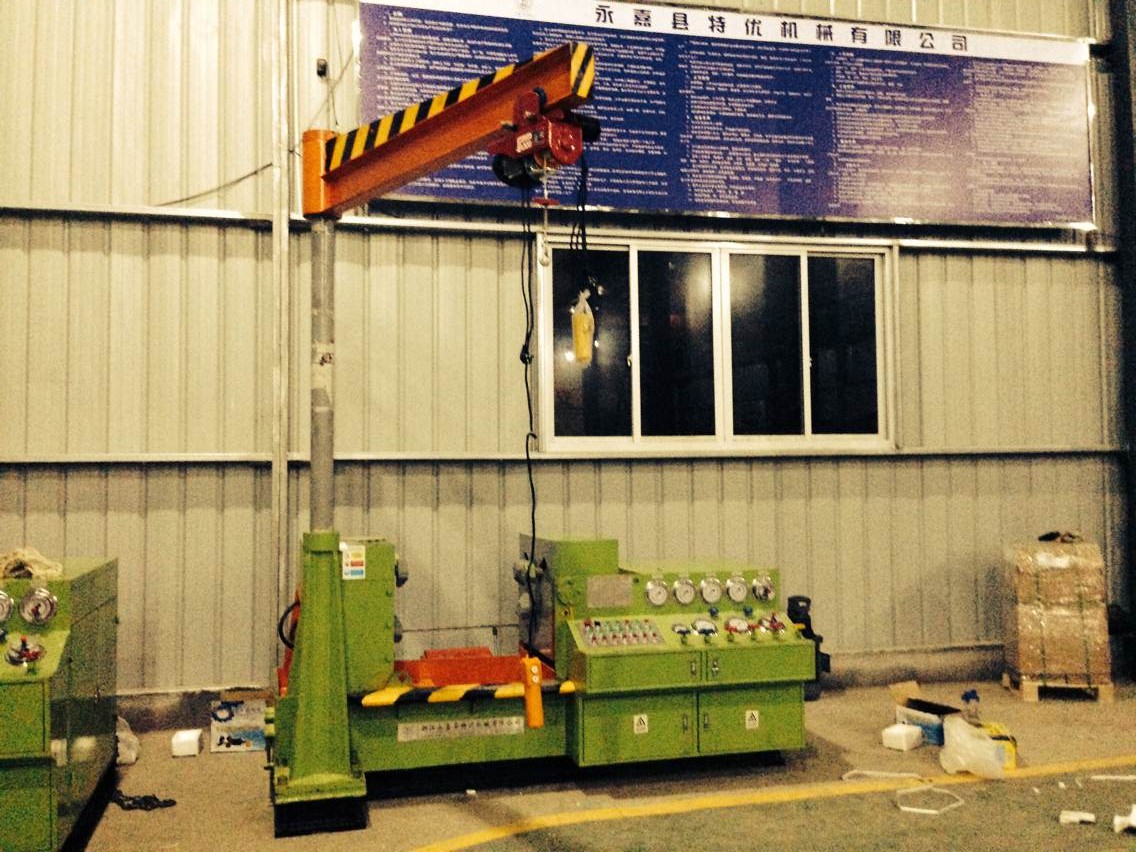 三、接通电源,按油泵启动按钮,检查电机转动方向,是否正确(顺时针方向)进行5—1 O分钟空载运转后,调节油泵压力在5 0MPa进行试机,各种动作,检查各管路有无泄漏,发现不良现象,应立即停机排除。